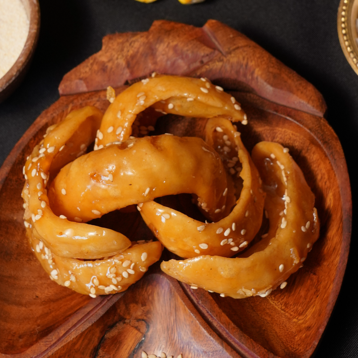 Baanali’s Bellam Gorumittulu has a crunchy yet crisp texture and sweet taste that is reminiscent of the traditional Andhra sweets.Dipped in Jaggery and its crescent shaped silhouette leaves a lasting sweet taste in your mouth.It is prepared with a combination of Jaggery, Sesame, Rice flour and Urad Dal.